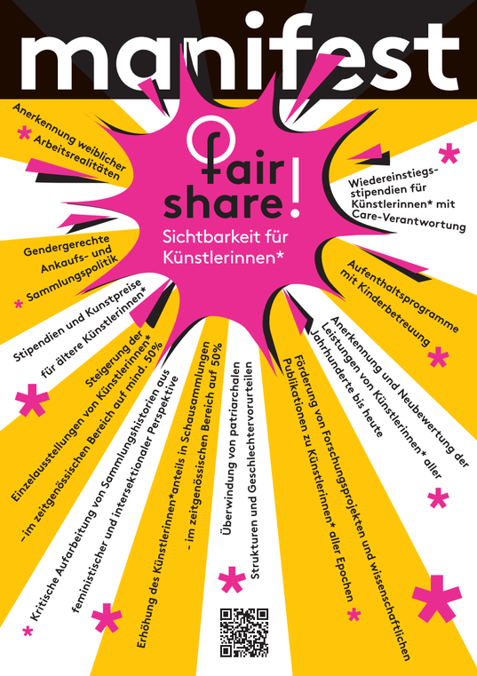 Kunst braucht Gleichstellung! Mehr als die Hälfte der Kunstschaffenden sind Frauen, daher müssen sie im Kultursektor gleichberechtigt mit ihren Werken sichtbar und im Diskurs vertreten sein. Lest unsere Forderungen im Manifest.