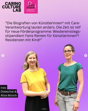 Ines Doleschal und Alice Münch vertreten fair share! und das Projekt kunst+care in dem community-getragenen Kompetenzzentrum für Gleichstellung und Vereinbarkeit im Kultursektor. Es setzt sich für die Sichtbarkeit, Anerkennung und strukturelle Verbesserung der Lebens- und Arbeitsbedingungen von Kulturschaffenden mit Sorgeverantwortung ein.